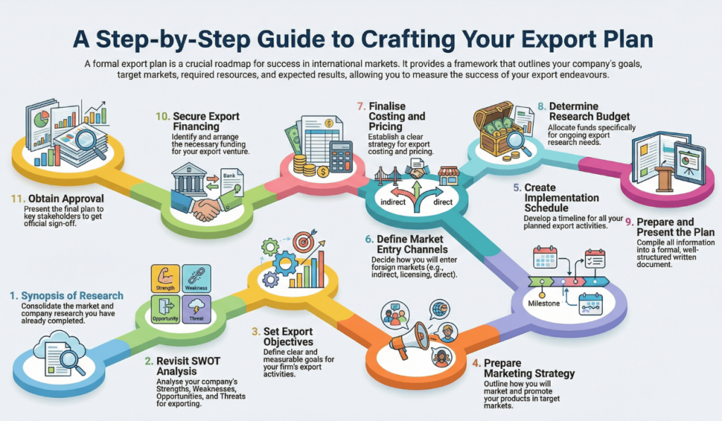 To ensure success in exporting (as, indeed, with any business) you must plan your exports (or business strategy) carefully. Planning and preparing for exports is a complicated process. It involves undertaking a lot of research and analysis of your firm and your intended target markets (which has already been done), setting export objectives, outlining your export marketing strategy, preparing an export budget, outlining an implementation schedule, and presenting and obtaining approval for the export plan.
